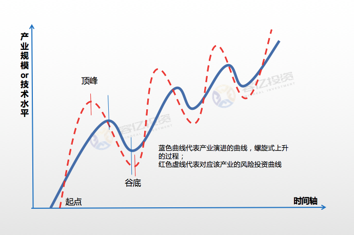 如果用蓝线表示产业周期,用红色虚线表示对应的产业投资周期的话,从三个时点看: