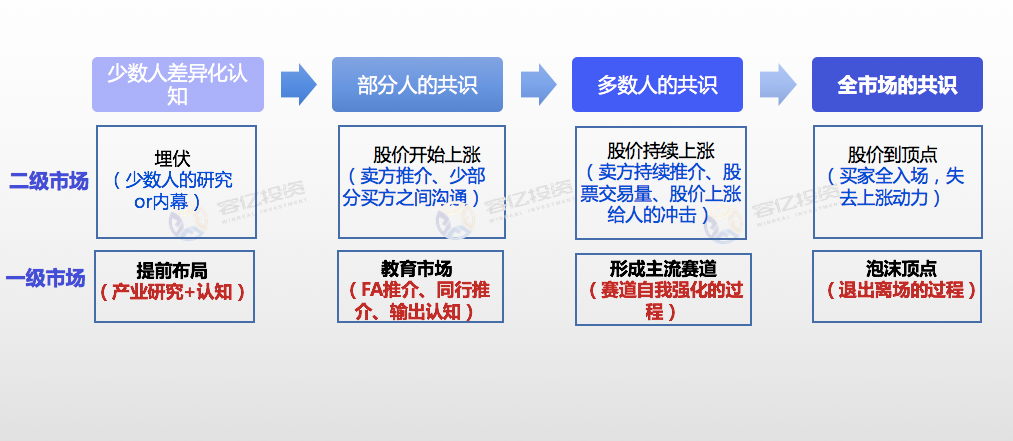 一开始少数人差异化认知布局某赛道,随着各种途径教育资本市场达成部分人的共识,部分人共识到达某个节点后该共识会迅速成为多数人的共识,这个过程是赛道自我强化的过程,从而形成当前的主流赛道,当达到全市场认知的时候,是赛道泡沫的顶点,也是退出离场的最后时机。在整个价值发现的过程中,少数人差异化认知本质上是企业价值发现的初始过程,此时企业还未有资本情绪带来的估值溢价,对于投资机构而言也有一定的定价权。因此投资赚的认知的钱实际上就是指价值发现前期这个“少数人差异化认知”。