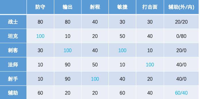 下面这张表格,对游戏各个角色的职业属性进行了划分。在不同游戏里有不同的设计,但基本原理类似。从企业团队的分工上能找到一些映射。