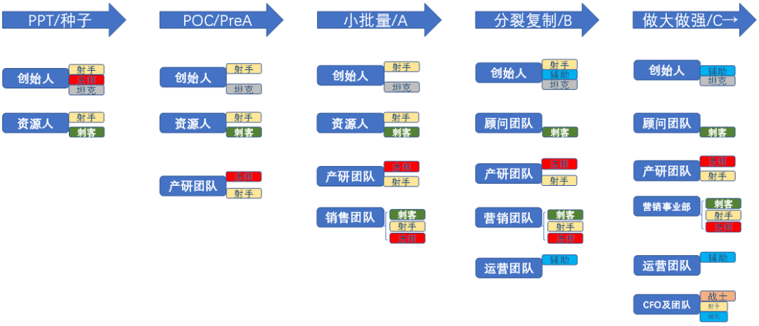 到了POC阶段,将研发交给更专业的人去做(CTO创业则继续干研发,而把其他工作找搭档分担掉)。到了小批量阶段,产品有了,要销售了,进一步增加了销售团队。这里的销售有特殊型销售(刺客),项目型销售(射手)或者2C产品类销售(法师)。