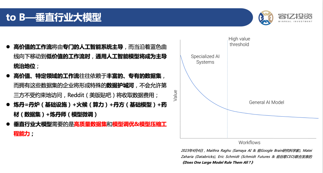 垂直行业大模型的核心关键点在于高质量的行业数据集和模型调优、压缩和部署的工程化能力。这也是投资机会点,就如同云原生时代下的容器机遇一样,大量传统行业中小B企业,需要依靠专业化的容器厂商帮助自己走上云原生的道路。
