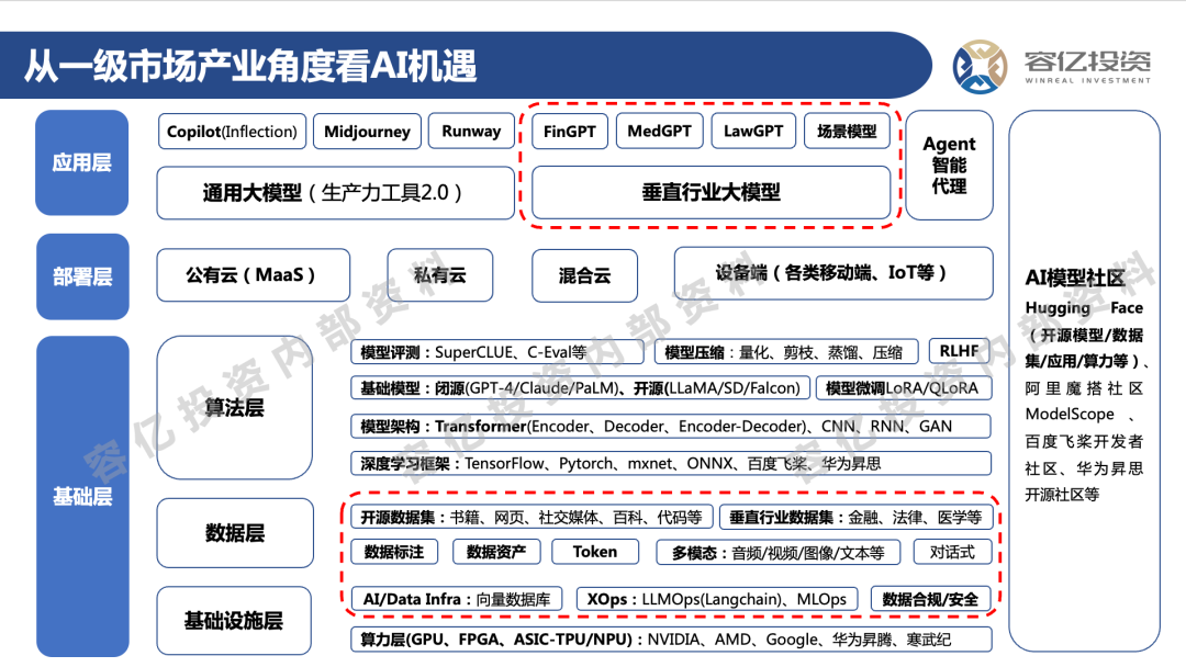 从一级市场投资角度系统性的看AI投资机遇,主要可以将其分为基础层、部署层和应用层,AI模型社区(极大降低大模型的开发和应用门槛)贯穿了这三层。