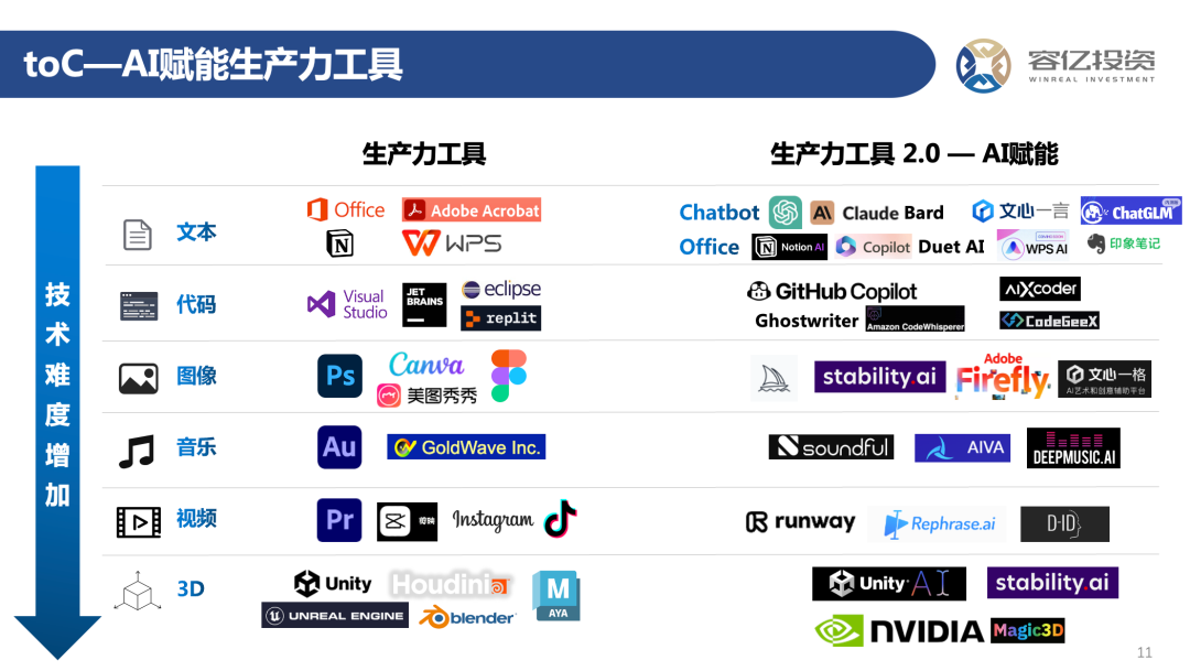 如今我们看到大模型已在文本、代码、图像、音乐、视频、3D等方面不同程度的渗透,各类新产品和新应用也层出不穷,例如文本领域的聊天机器人和办公产品copilot,代码领域的GitHub copilot,图像领域的Midjourney和Stable Diffusion,之前音乐领域火爆一时的AI孙燕姿,视频领域的runway等等,国内如百度、金山办公、印象笔记、智谱华章等也纷纷推出了类似的AI产品,都在不同程度地改变传统生产力工具的形态,但目前还仅限于各领域工业生产过程中的效率工具,无法实现真正意义上的AGI。