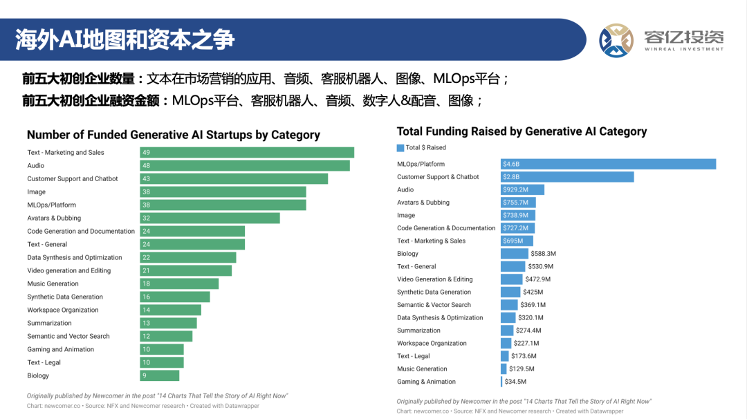 最后谈一下海外AGI赛道的资本关注点:从投资数量来看,前五大分别是营销类文本应用、音频、客户支持/客服机器人、图像和MLOps平台;从融资金额角度来看,资金更多地流向了MLOps平台,它的核心价值在于降低开发大模型门槛,其次是客服机器人、音频、数字人及配音、图像。