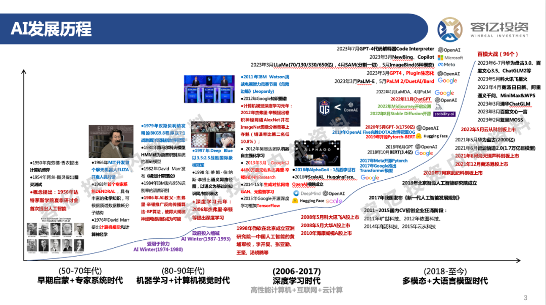 国内的AI发展史最早可以追溯到1998年成立的微软亚洲研究院,微软亚洲研究院可以说是中国人工智能的黄埔军校,如今国内熟知的创新工厂、百度、金山软件、阿里巴巴、商汤、旷世等公司,背后的创始人和核心团队都来自于微软亚洲研究院。国内第一批AI公司科大讯飞、大华、海康威视于2008年-2010年前后在国内A股上市。2011年-2015年,国内涌现出不少计算机视觉创业企业,例如AI四小龙旷世(2011年成立)、依图(2012年成立)、商汤(2014年成立)、云从(2015年成立)等。2018年,国家队—北京智源人工智能研究院成立。这次大型模型的发展也受益于这股浪潮。2002年以来,寒武纪、商汤、海天瑞声、云从等AI相关企业相继在科创板和港股上市。
