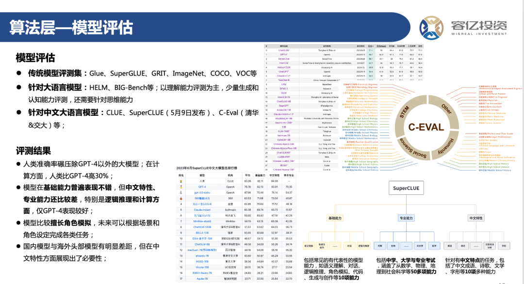 在各类大模型百花齐放、百模大战的时代,模型评测成为了衡量各类模型能力的核心工具。目前,市面上已出现面向传统小模型(GLUE、SuperGLUE等)、针对大语言模型(HELM、BIG-Bench等)和针对中文大语言模型(SuperCLUE、C-Eval等)的各类评测工具。像SuperCLUE和C-Eval,在其评测集内增加了大量具有中国特色的问题(毛泽东思想、马斯克主义基本原理等)和中文特性(成语、诗词、文言文等)等维度。从评测结果来看,除了GPT-4、GPT-3.5和Claude,国内大模型产品在整体评测表现上都优于其他海外模型,因此训练中文大模型的必要性还是非常高的。