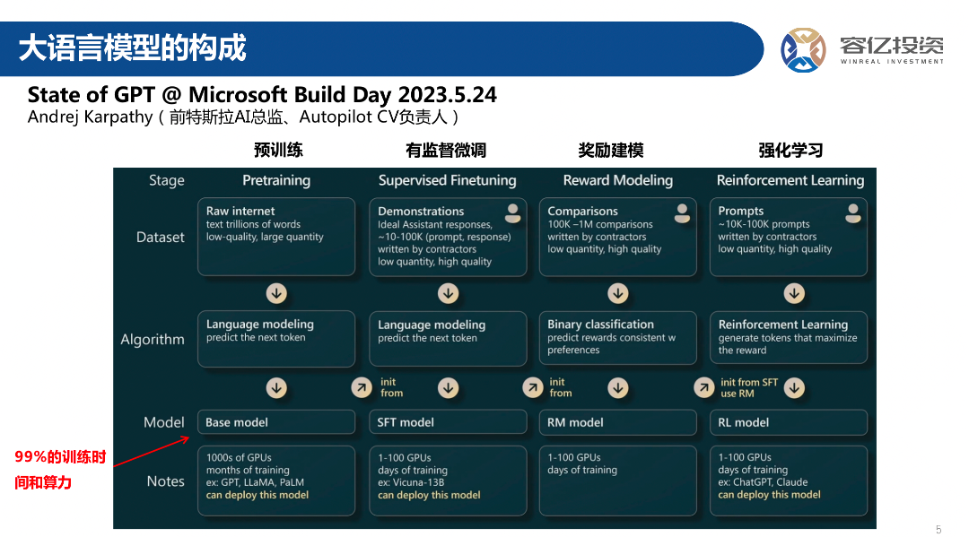 回到大语言模型本身,推荐大家去看下OpenAI联合创始人Andrej Karpathy之前在微软开发者大会上分享的State of GPT主题演讲。他将大模型的训练过程拆解成了四个阶段: