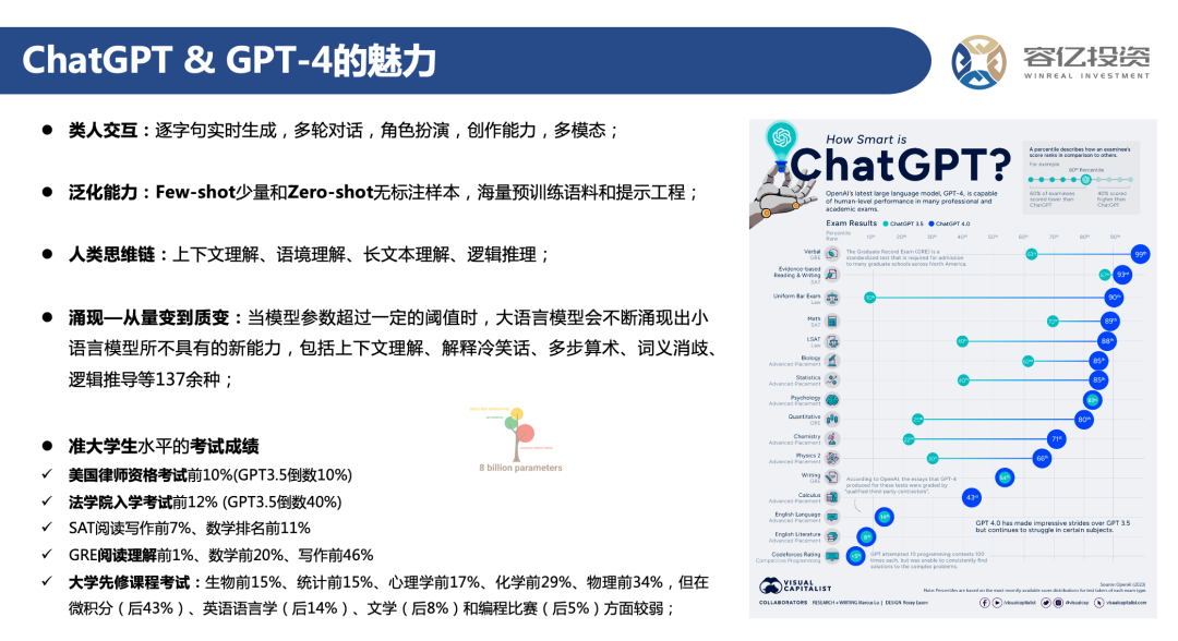 上述这些能力其实都是伴随着模型参数的增加以及训练时间的延长,才涌现出来的新的能力。此外,我们可以看到GPT-4在人类各项考试方面,成绩也非常优秀,基本上可以达到准大学生的水平。