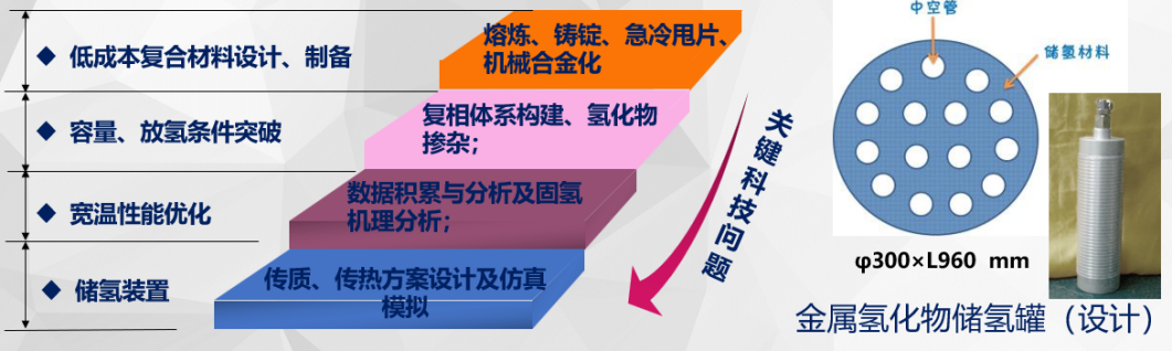 以固态储氢子系统来说,目前技术仍处于发展阶段。由于其工作压力低、安全性好,氢化物储罐、阀门、配管管路等附属装置的研发生产难度不大,重点在于提升储氢材料性能、优化储氢系统控制管理。比如通过储氢材料的成分设计、催化体系选择、工艺参数制定等,提高重量储氢密度、延长循环寿命、削减材料成本等。此外,尽管储氢合金本身的体积储氢密度很高,但储氢系统靠罐内换热管道实现加热冷却,介质流经不同位置的热交换将影响储氢合金的反应速率,因此系统传质、传热设计,仿真模拟和内部结构实现是技术难点,也是控制储氢能量损耗和成本的关键。